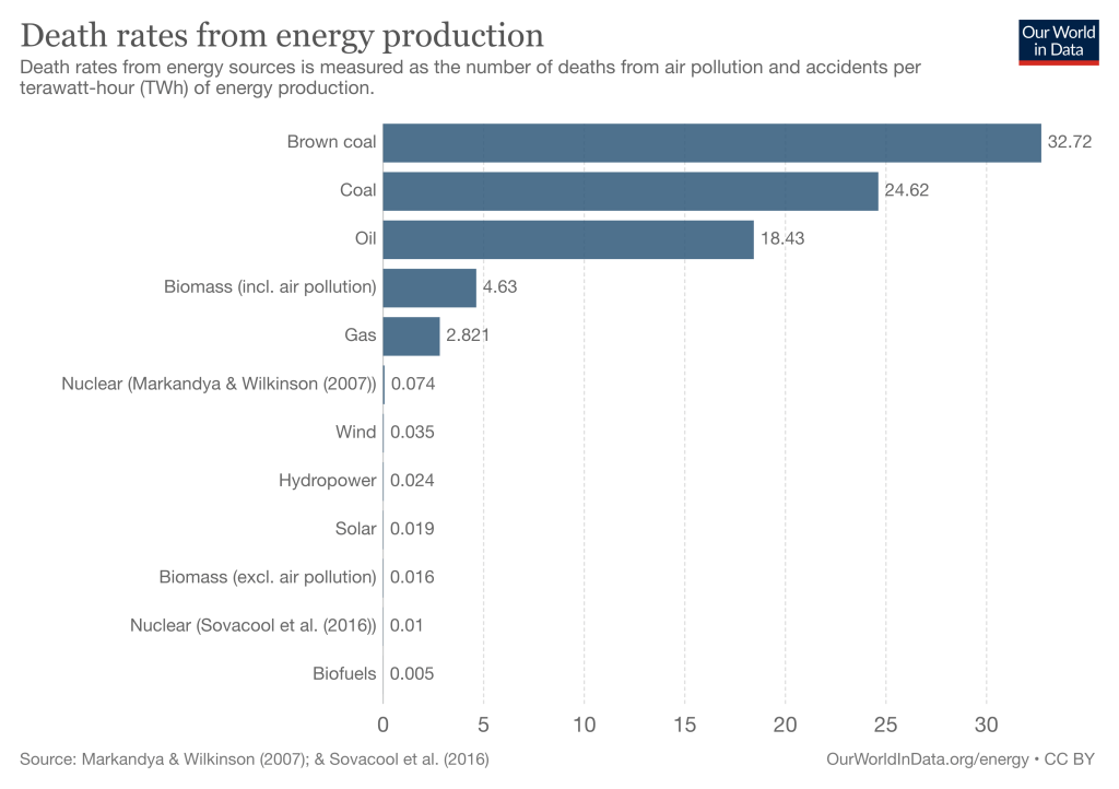 A transition to renewable energies not only concerns peak-oil and climate change but also public-health: fossil fuels (coal and oil, in particular) are the highest sources among deaths by air contamination per TWh of energy produced (Figure 4).