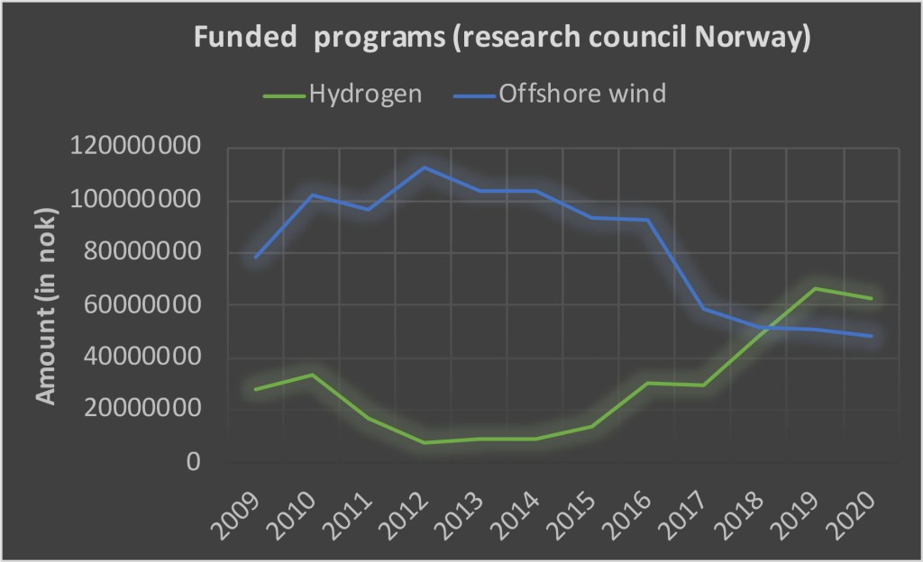 (Right) Granted hydrogen and offshore wind projects. Data retrieved from forskingsrådet.no