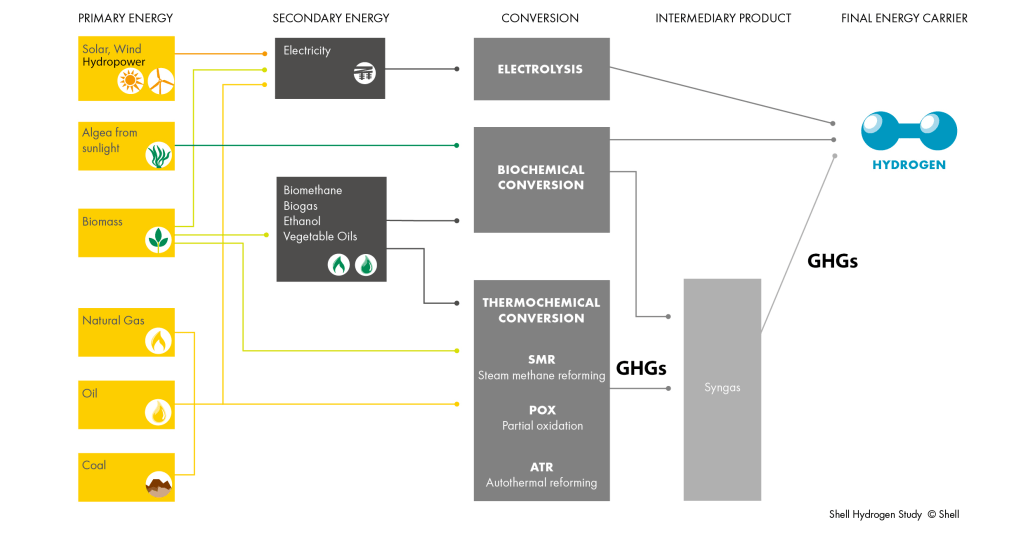 Hydrogen can be produced from several ways (Figure 3), yet the only null-GHG emission production comes from water electrolysis; consisting on splitting the water molecule (H2O) into its hydrogen and oxygen components. This process requires 50 kWh of electrical energy, approximately, to produce 1 kg of hydrogen [3] and it is seen as being a low efficiency process. This is why a famous technology entrepeneur referred to hydrogen as “bullshit” [4], as it is more efficient to directly charge electrical batteries than to use that electricity to produce hydrogen.